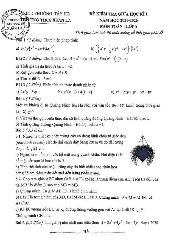 MATHX gửi đến quý phụ huynh và các em học sinh đề kiểm tra giữa học kì 1 trường THCS Xuân La - Tây Hồ năm học 2025 - 2026 kèm đáp án tham khảo.