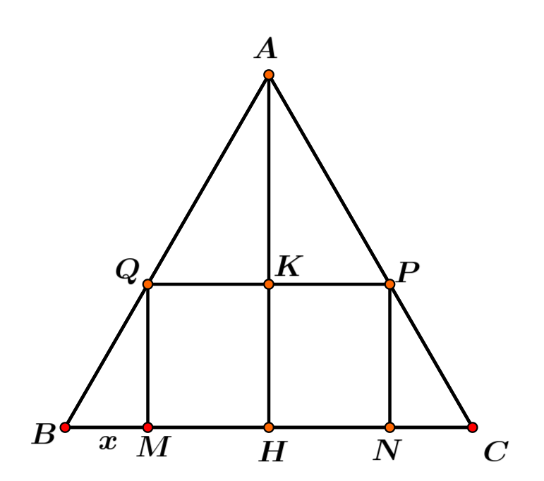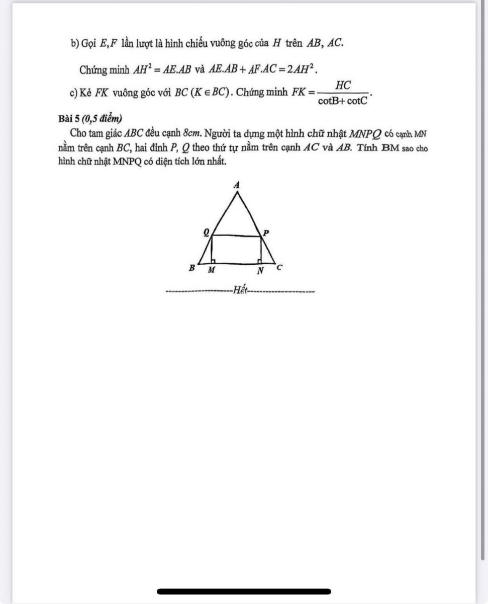 Câu V: Cho tam giác ABC đều cạnh 8 cm. Người ta dựng một hình chữ nhật MNPQ có cạnh MN nằm trên cạnh BC, hai đỉnh P, Q theo thứ tự nằm trên cạnh AC và AB. Tính BM sao cho hình chữ nhật MNPQ có diện tích lớn nhất.