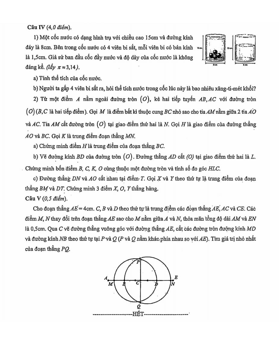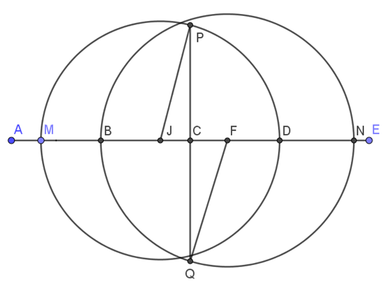 Bài 5. Cho đoạn thẳng AE = \(4\) cm. C, B và D theo thứ tự là trung điểm các đoạn thẳng AE, AC và CE. Gọi M, N thay đổi trên đoạn thẳng AE sao cho M nằm giữa A và N, thỏa mãn tổng độ dài AM và EN bằng \(0,5\) cm. Qua C vẽ đường thẳng vuông góc với đường thẳng AE, cắt các đường tròn đường kính MD và đường kính NB theo thứ tự tại P và Q (P và Q nằm khác phía so với AE). Tìm giá trị nhỏ nhất của đoạn thẳng PQ.