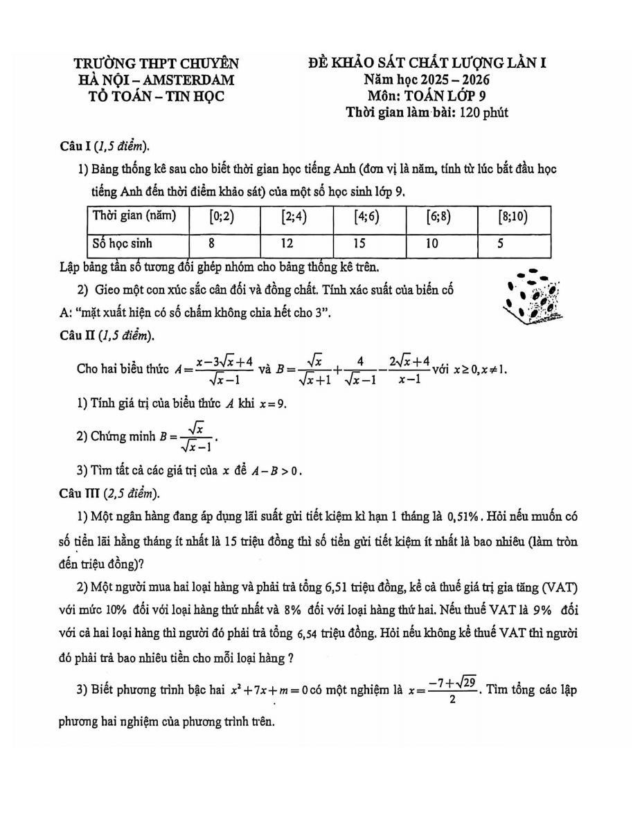 Đề khảo sát chất lượng lần 1 năm 2025 - 2026, trường THPT chuyên Hà Nội - Amsterdam.