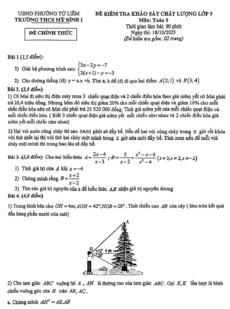 MATHX gửi quý phụ huynh và các em học sinh Đề khảo sát chất lượng tháng 10 - Trường THCS Mỹ Đình 1 - Hà Nội kèm đáp án tham khảo câu cuối.