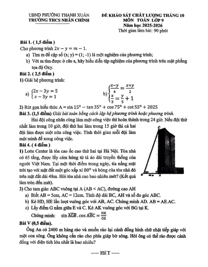 MATHX gửi quý phụ huynh và các em học sinh Đề khảo sát chất lượng tháng 10 Trường THCS Nhân Chính - Thanh Xuân - Hà Nội năm 2025 - 2026