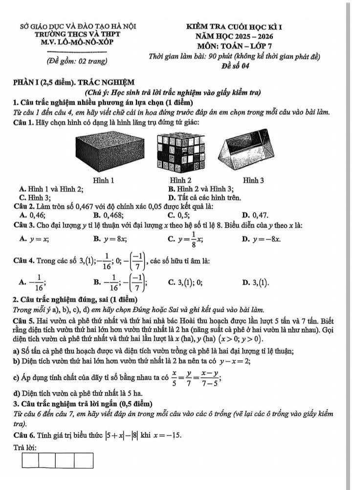 MATHX gửi quý phụ huynh và các em học sinh đề kiểm tra cuối học kì 1 Lớp 7 trường THCS và THPT M.V. Lô-Mô-Nô-Xốp Hà Nội năm 2025 - 2026 kèm đáp án câu cuối cùng.