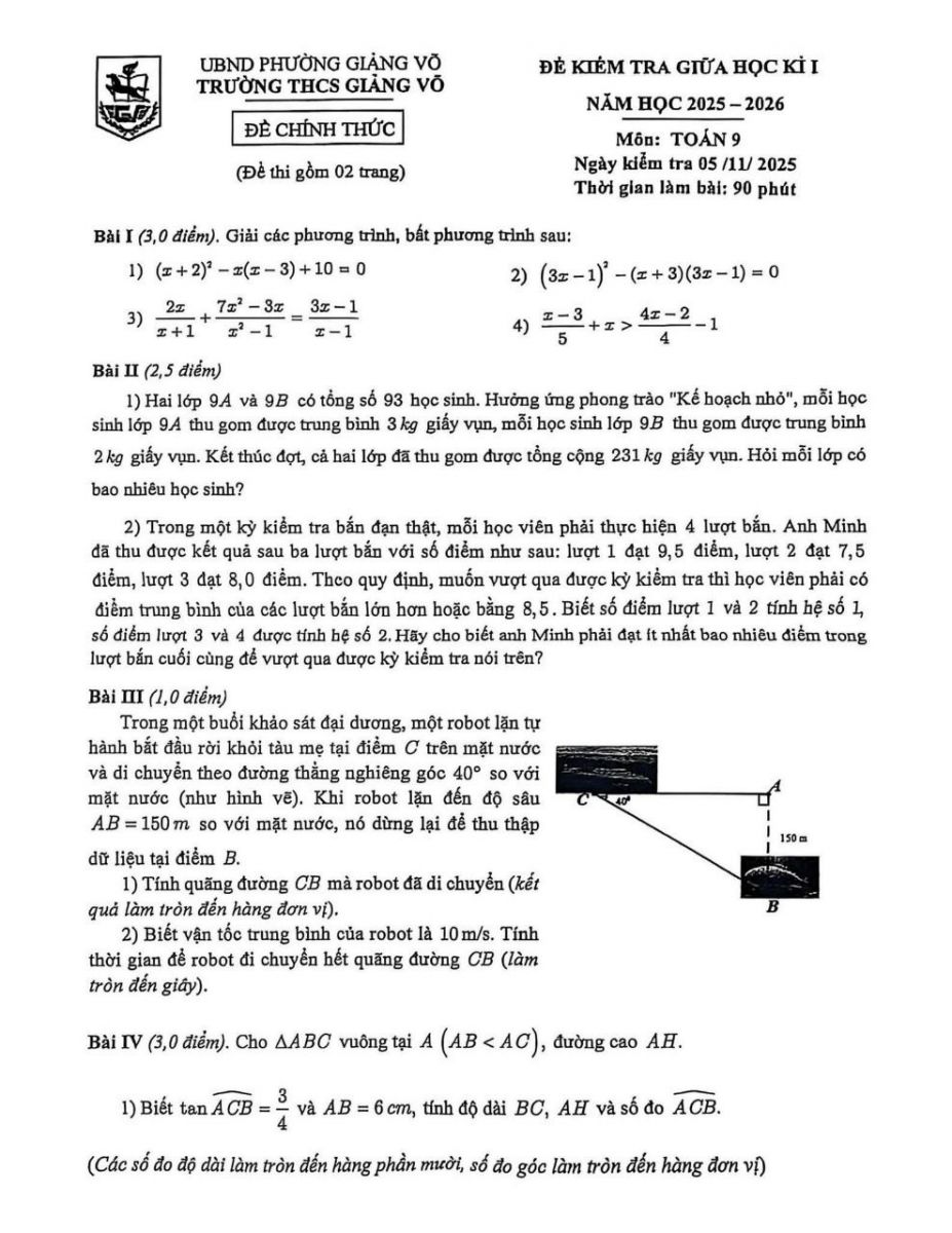 MATHX gửi đến quý phụ huynh và các em học sinh đề thi giữa học kì I lớp 9 trường THCS Giảng Võ Hà Nội năm 2025 - 2026 kèm đáp án tham khảo.