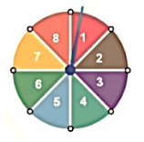 Câu 5. Hình bên mô tả hình tròn được chia làm 8 phần bằng nhau, mỗi phần được đánh số từ 1 đến 8. Chiếc kim được gắn một đầu vào tâm của hình tròn. Quay hình tròn một lần. Tính xác suất của biến cố:
