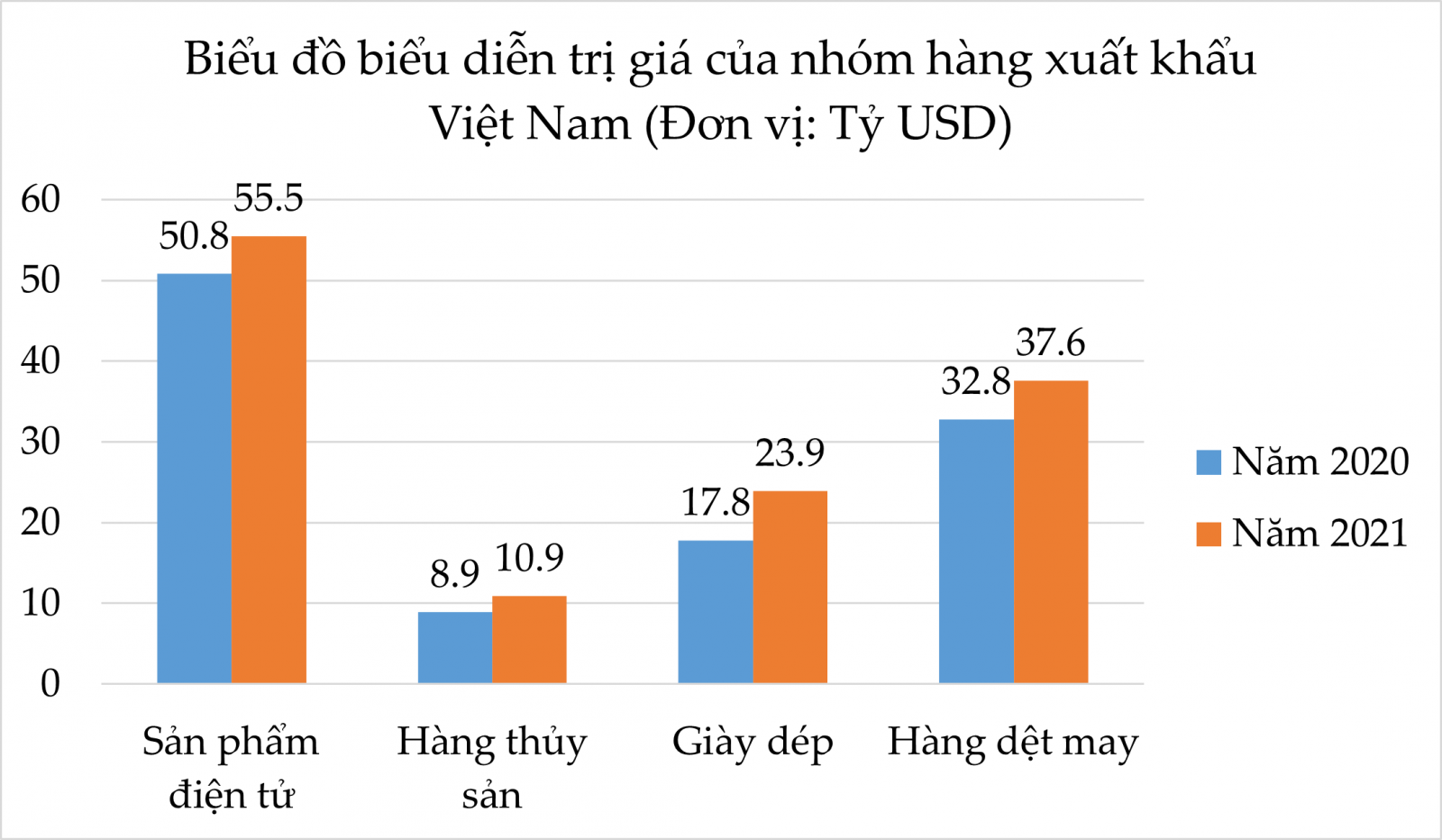 b) Năm 2021, sản phẩm điện tử xuất khẩu tăng \( 55{,}5 - 50{,}8 = 4{,}7 \) tỷ USD so với năm 2020.