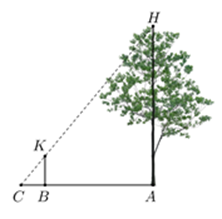 Hình vẽ bên mô tả cách đo chiều cao của cây phi lao. Biết cọc \( BK \) vuông góc với mặt đất. Các thông số đo được như sau: \( BC = 1\,m \), \( AB = 6{,}5\,m \), \( BK = 1{,}2\,m \).