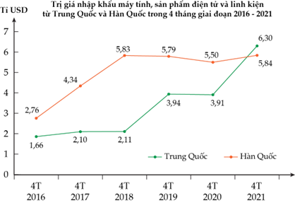 c) Năm nào giá trị nhập khẩu máy vi tính, sản phẩm điện tử và linh kiện điện tử từ Trung Quốc lớn hơn từ Hàn Quốc?