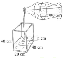1) Một cái bể hình hộp chữ nhật và một cái chai có kích thước và thể tích như hình bên dưới. Cho biết một chai nước đổ hết vào bể có thể tích là \( 2000\,\mathrm{cm}^3 \). Tính chiều cao mực nước sau khi rót hết một chai nước vào bể.