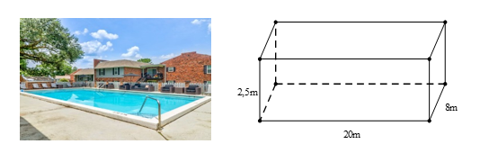 1) Một hồ bơi dạng hình hộp chữ nhật có kích thước trong lòng hồ: chiều dài 20 m, chiều rộng 8 m, chiều sâu 2,5 m như hình vẽ. Tính thể tích của hồ bơi?