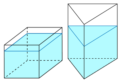 b) Nếu đổ hết nước từ khay này sang một bình hình lăng trụ đứng tam giác thì chiều cao mực nước trong bình là 10 cm (như hình vẽ bên dưới). Tính diện tích mặt đáy của bình lăng trụ đứng tam giác.