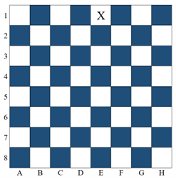 Bàn cờ vua gồm 8 hàng (đánh số từ 1 đến 8) và 8 cột (đánh các chữ cái từ A đến H). Vua trắng nằm ở ô E1, quân cờ đối xứng với nó qua các trục đối xứng của bàn cờ nằm trên các ô nào (địa chỉ một ô được xác định gồm tên cột–tên hàng)?