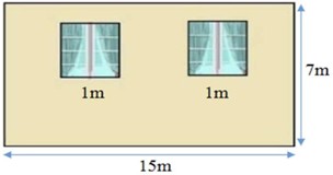 Bố bạn Lan thuê thợ để sơn một bức tường hình chữ nhật có kích thước chiều dài 15 m, chiều rộng 7 m. Trên bức tường đó có hai ô cửa sổ có dạng hình vuông có độ dài cạnh là 1 m.