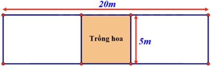 Nhà bà Lan có mảnh vườn hình chữ nhật có độ dài các cạnh là \( 20\,\mathrm{m} \) và \( 5\,\mathrm{m} \) như hình vẽ. Bà Lan định trồng hoa ở phần đất hình vuông ở giữa vườn như hình vẽ và trồng cỏ ở phần đất còn lại.