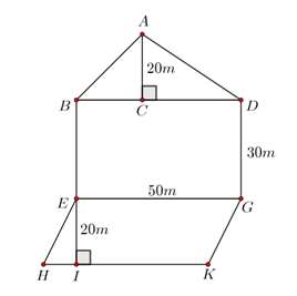 Mảnh đất nhà ông Nam gồm phần đất hình tam giác \( ABD \), phần đất hình chữ nhật \( BDGE \) và phần đất hình bình hành \( EGKH \) có các kích thước như hình vẽ bên dưới.