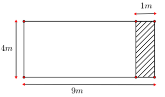 Một khoảng sân có dạng hình chữ nhật với chiều dài 9 m và chiều rộng 4 m. Người ta để một phần của sân để trồng hoa (phần kẻ sọc), phần còn lại lát gạch (phần trắng).