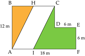 b) Bác Minh chia mảnh đất thành 3 phần như hình vẽ. Phần thứ nhất là hình tam giác ABH dùng để trồng hoa. Phần thứ hai là hình bình hành AHCI có diện tích \( 272\,\mathrm{m}^2 \) dùng để đỗ xe. Phần còn lại bác dùng để làm ao cá. Tính diện tích bác Minh dùng để trồng hoa và làm ao cá.