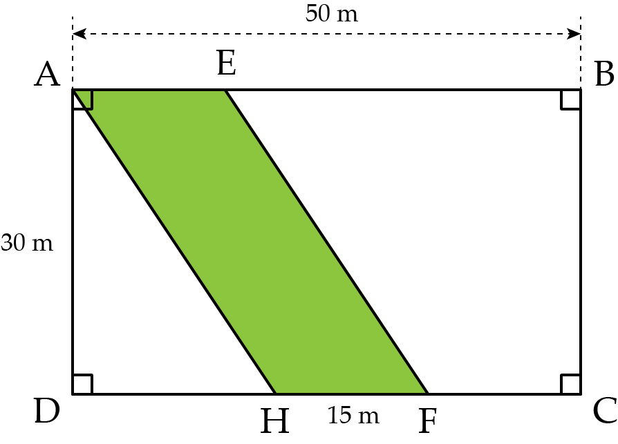 Một mảnh đất có dạng hình chữ nhật ABCD, với chiều dài \( AB = 50\,\mathrm{m} \), chiều rộng \( AD = 30\,\mathrm{m} \).