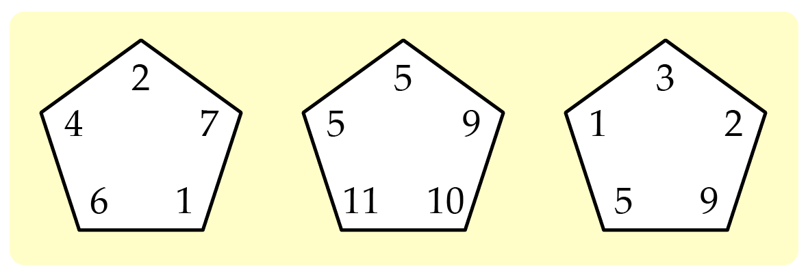 Vì mỗi số ở ngũ giác giữa = tổng của hai số ở cùng vị trí của ngũ giác trái và phải: Đỉnh: 2 + 3 = 5 Trái: 4 + 1 = 5 Phải: 7 + 2 = 9 Dưới trái: 6 + 5 = 11 Dưới phải: 1 + 9 = 10 => ?=10