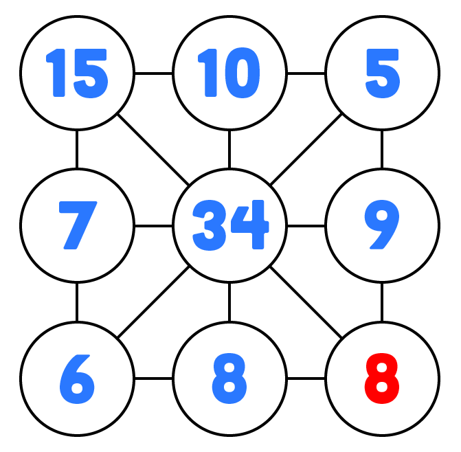 đáp án là 8. Giải thích ngắn: tổng bốn ô ở giữa các cạnh là 10 + 7 + 9 + 8 = 34 (bằng tâm). Vì vậy tổng bốn góc cũng phải là 34: 15 + 5 + 6 + ? = 34 → ? = 34 − 26 = 8.