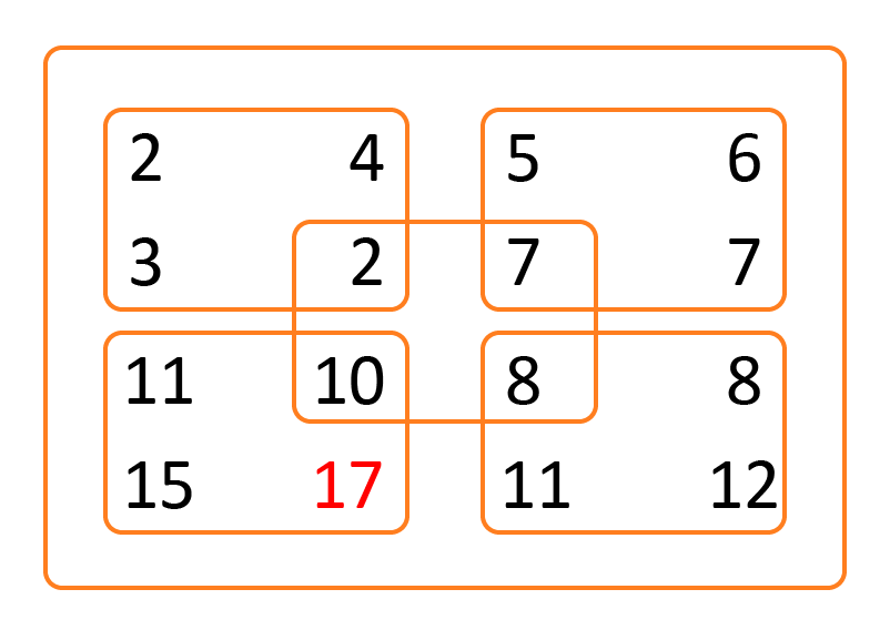Đừng nhìn vào hình chữ nhật ở giữa mà hãy quan sát bốn hình còn lại và để ý tới khoảng cách giữa các số ở các góc tương ứng.
