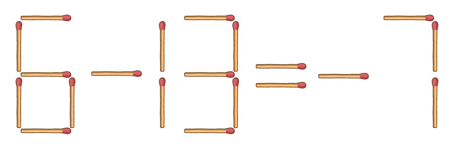 Lấy 1 que ở số 8 (bên trái phía dưới) → số 8 biến thành 6 Đặt chính que đó đứng trước số 7 → tạo thành −7 ➡️ Kết quả cuối cùng: 6 − 13 = −7
