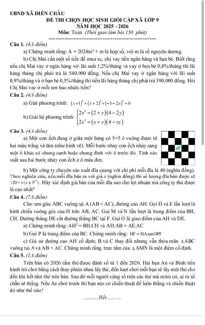 MATHX gửi quý phụ huynh và các em học sinh Đề chọn học sinh giỏi lớp 9 môn Toán năm 2025 - 2026 xã Diễn Châu - Nghệ An kèm đáp án tham khảo.