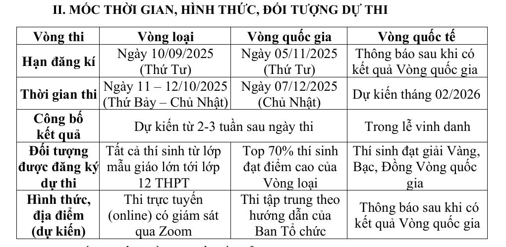 Ban Tổ chức Việt Nam Kỳ thi Olympic Toán học quốc tế TIMO 2025-2026 kính gửi tới Quý trường, quý phụ huynh và thí sinh các thông tin về kỳ thi, cụ thể như sau: