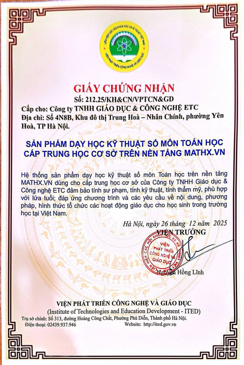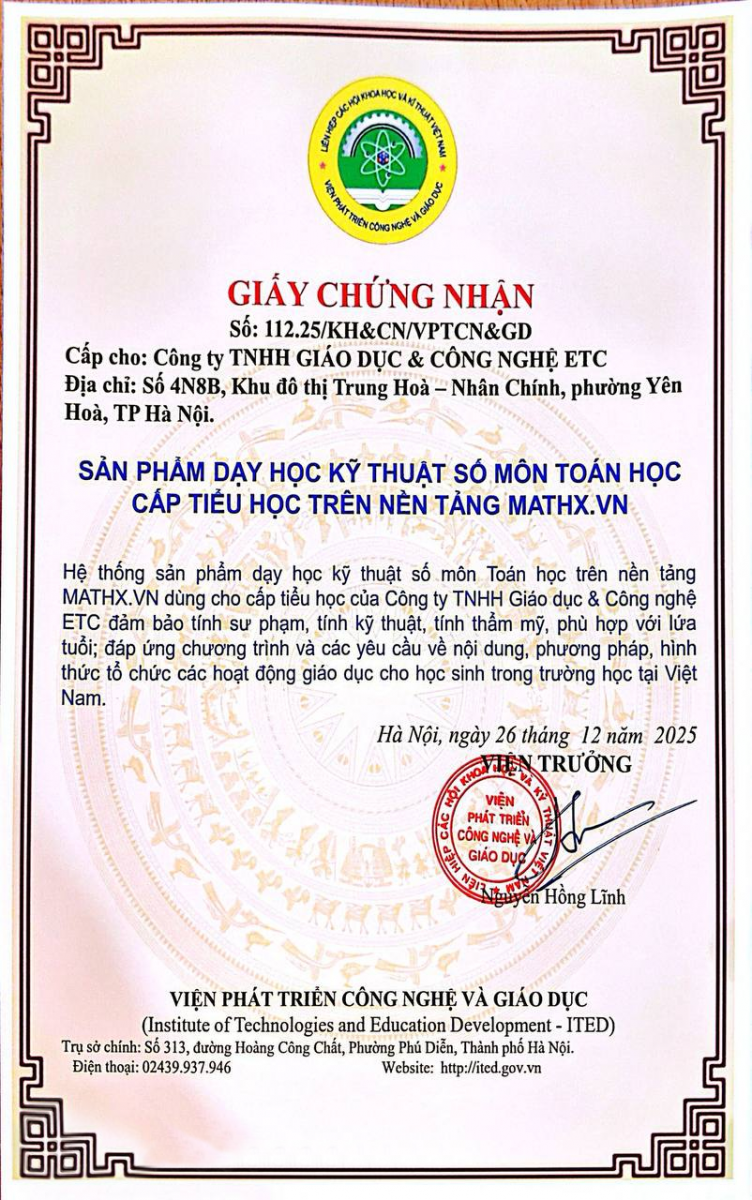 GIẤY CHỨNG NHẬN SẢN PHẨM KỸ THUẬT SỐ MÔN TOÁN HỌC CẤP TIỂU HỌC VÀ TRUNG HỌC CƠ SỞ TRÊN NỀN TẢNG MATHX.VN ĐƯỢC VIỆN PHÁT TRIỂN CÔNG NGHỆ VÀ GIÁO DỤC CẤP